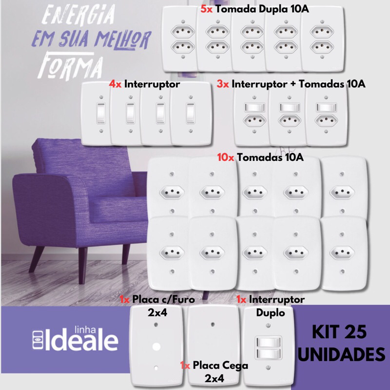Kit Casa Completo 25 Peças Tomada Interruptor Ideale Pluzie 10 Tomada10A 4 Interruptor 5 Tomada Dupla 10A 3 Interruptor Com Tomada10A 1 Interruptor Duplo 1 Placa Cega 1 Placa Cega Com Furo 2x4