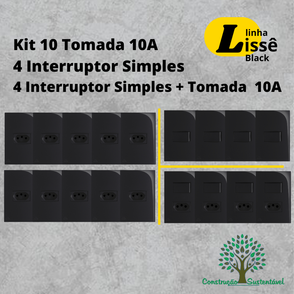 Kit 10 Tomada 10A + 4 Interruptores + 4 Interruptor com Tomada 10A Linha Lissê Black Preto Brilhante