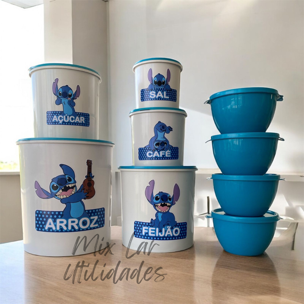 Kit de potes mantimentos cozinha com 5 peças plástico Stitch + jogo 10 potes para cozinha