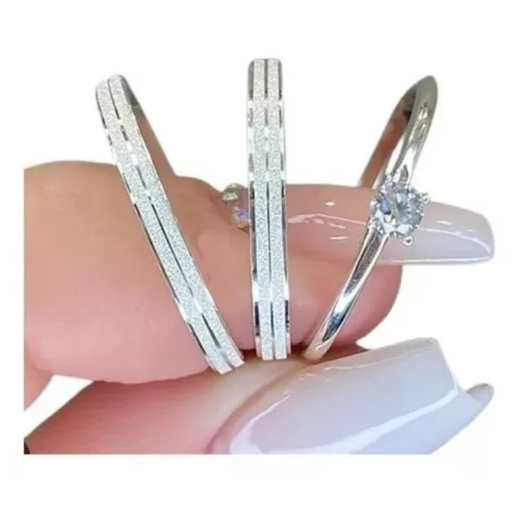 Aliança De Namoro Prata 3mm Fina + Solitário 925 Par Anel De Compromisso 950 Aço Inoxidável 316L