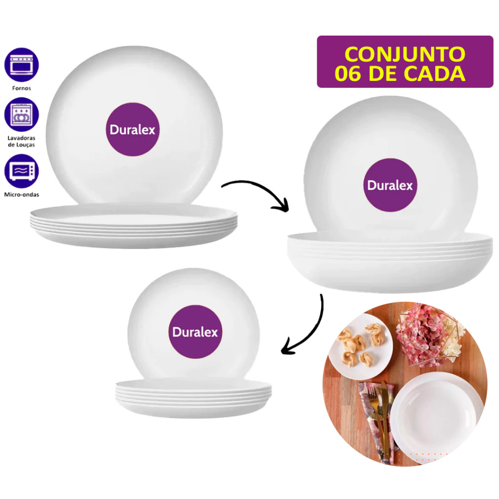 Jogo 18 Pratos 06 Fundo+06 Raso+06 Sobremesa Vidro Branco Duralex Menu Opaline Jogo Jantar Borda Ondulada Torta Sorvete Doce Redondo Resistente Nadir Figueiredo Conjunto Cozinha Porcelana Formato Almoço Platos