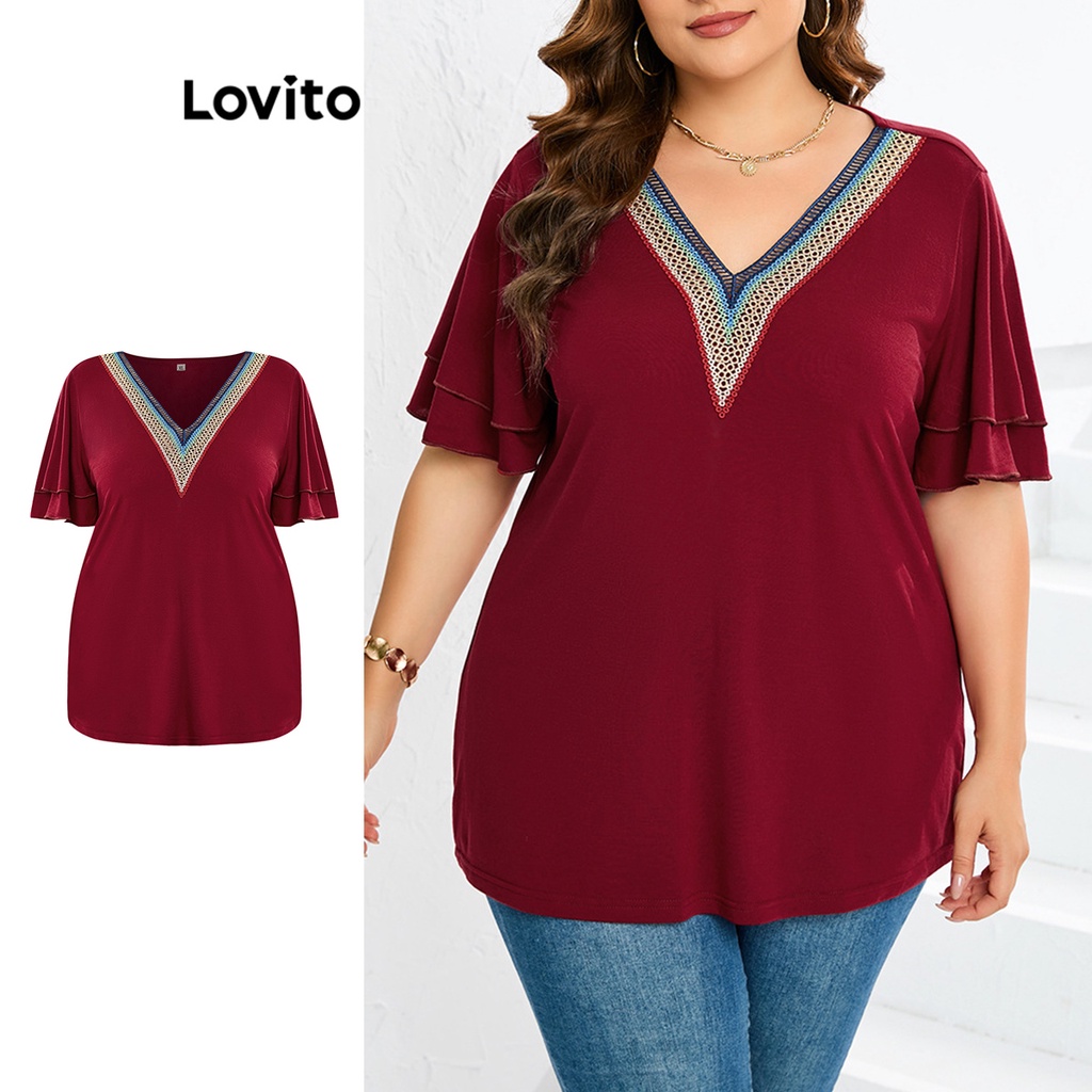 Lovito Camiseta Feminina Plus Size Curva Casual Tecido De Renda Com Costura Contrastante Gola LBE02082 (Borgonha)