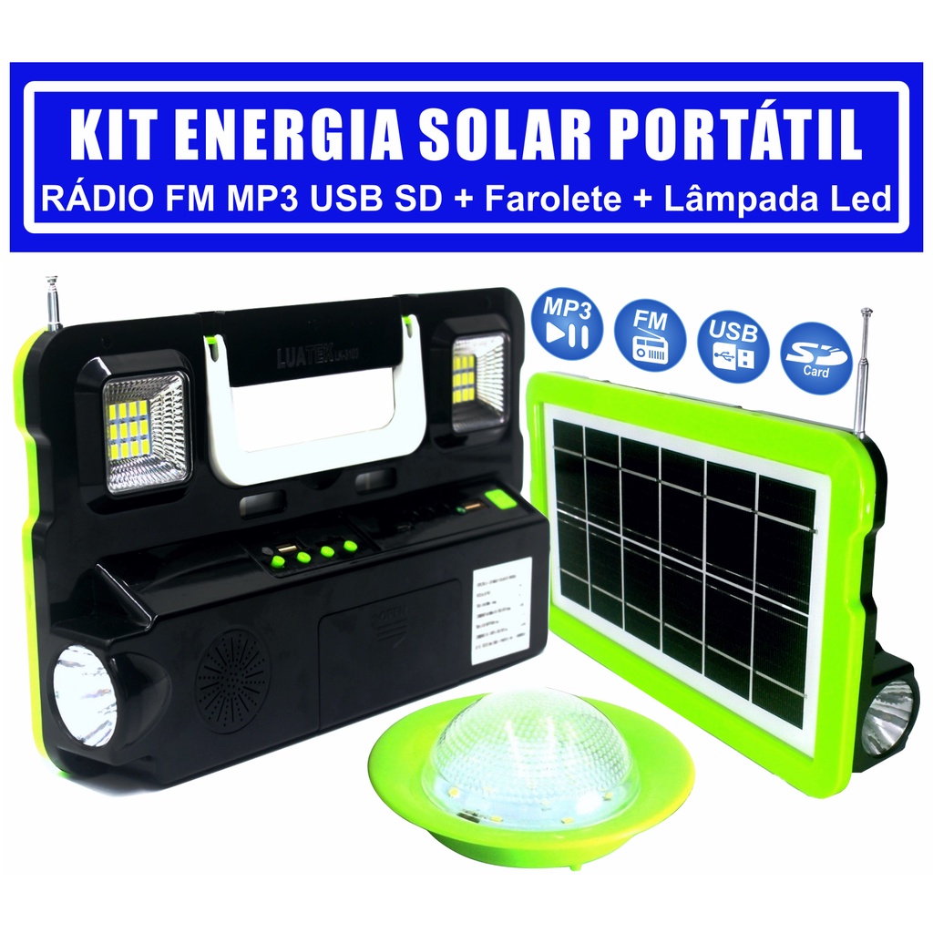 Kit Painel Solar Fotovoltaico Rádio FM MP3 USB SD, Lampada Led Lanterna Luz Emergência