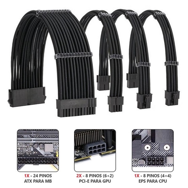 Kit 4 Cabos Sleeved Preto Extensor Fonte Atx Gpu Eps Pci-e