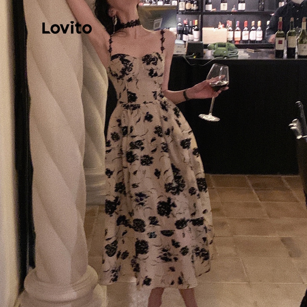 Lovito Casual Vestido Feminino Floral Midi Skatista Sem Mangas com Zíper e Decote Quadrado LNA11055 (Preto)