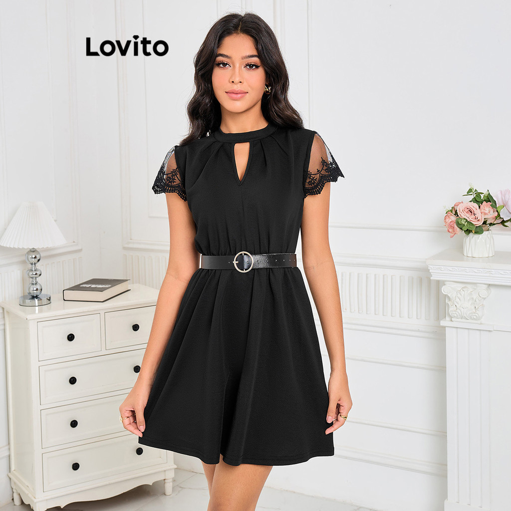 Lovito Vestido Casual Liso Com Renda Dividida E Estrutura Dividida Para Mulheres LBE03149 (Preto)
