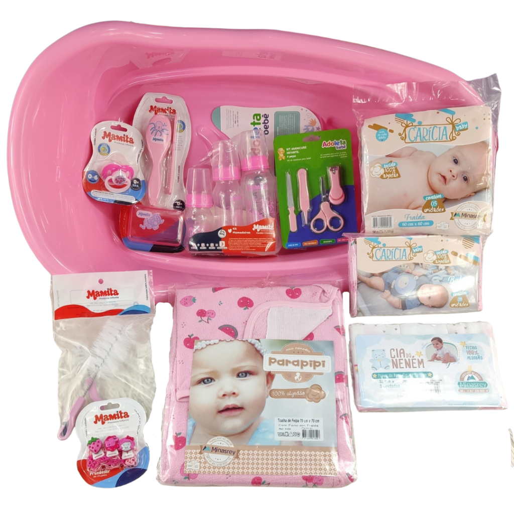 Kit Banho do Bebê Completo - Banheira de 20Litros Resistente com Válvula de Escape Adoleta, Toalha de Banho, Mamadeira Mamita, Kit Fralda 5UN e Vários Ítens Para o Enxoval do Bebê.