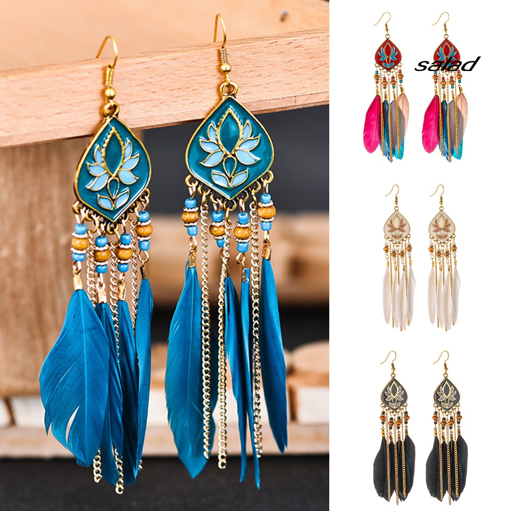 Sd Brinco Feminino Longo Com Pena De Losango Com Contas / Pingente Pendurado / Bijuteria De Festa