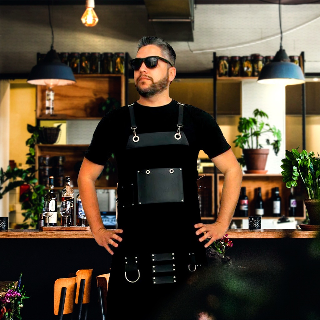 Avental Barbeiro Cabeleireiro Tecido e Couro ecológico Barbearia c hurrasqueiro rarman bartender petshop profissional