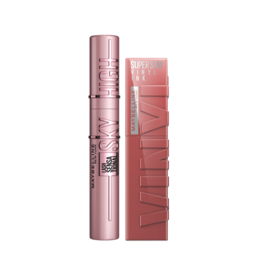 Kit Maybelline 01 Máscara de cílios lavável Sky High + Batom Líquido SupersStay Vinyl Ink Cheeky