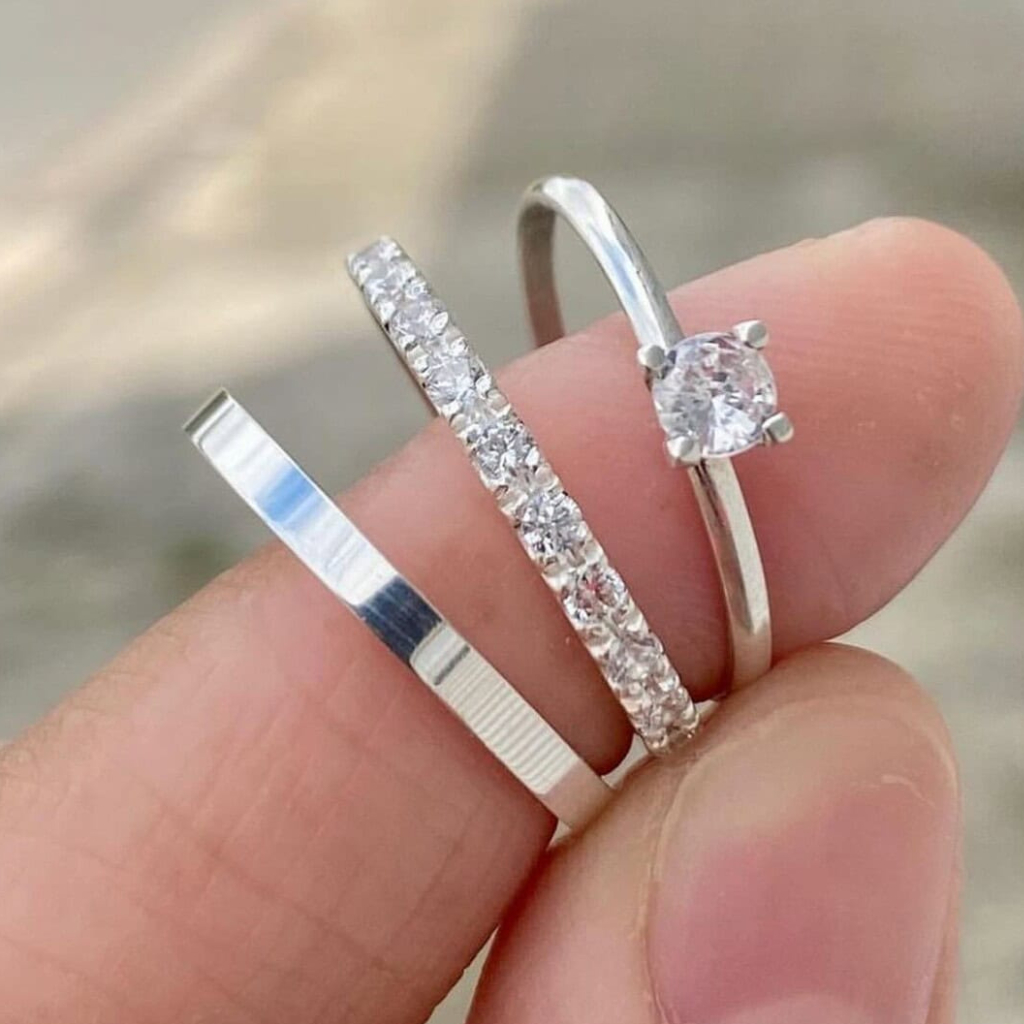 Par de Alianças e Anel Solitario Compromisso Namoro Prata Fina 4mm Chanfrada Aço inoxidável