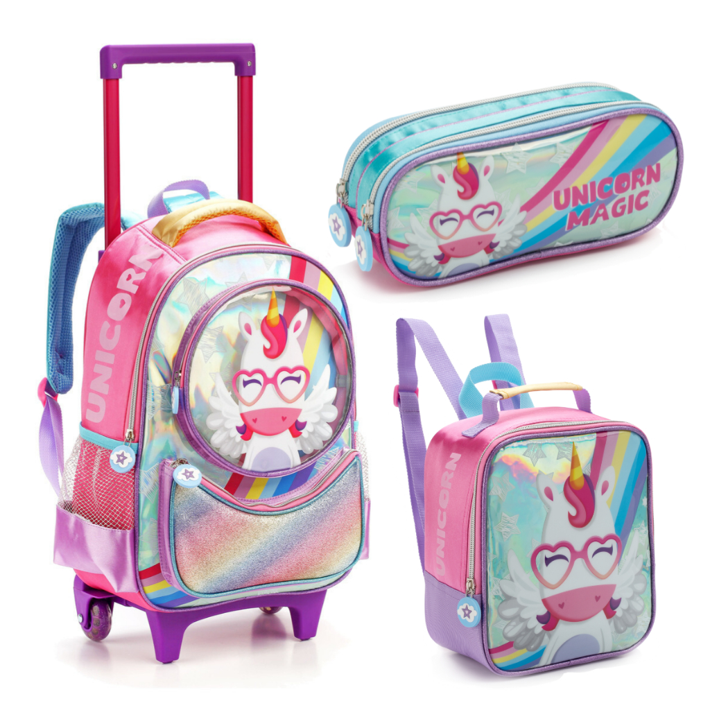 Kit Mochila Infantil Escolar Rodinha Unicórnio Magic Feminina Impermeável