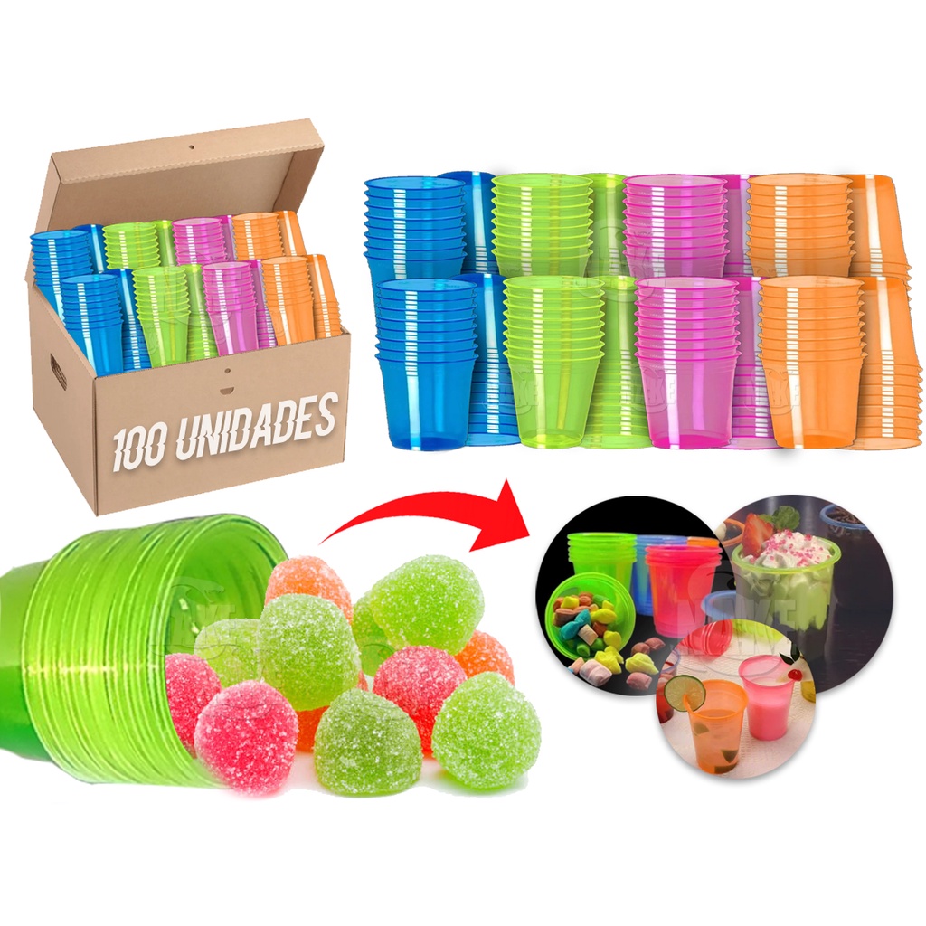 Copo Descartável De Shot Tequila Neon 30ml C/ 100un Biodegradável Copinho Shots Balada Brigadeiro Drinks Cores Vibrantes
