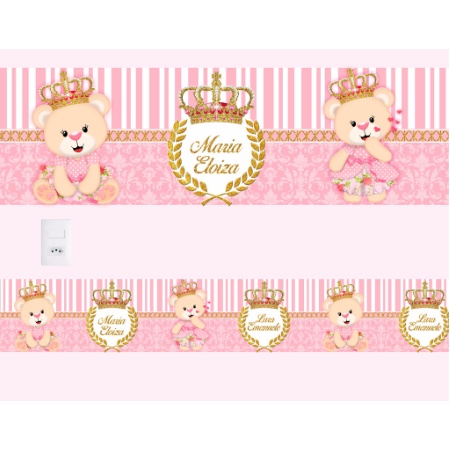 Papel de Parede + Faixa Personalizada Embutida Tema Ursa Princesa Quarto de Bebê m²