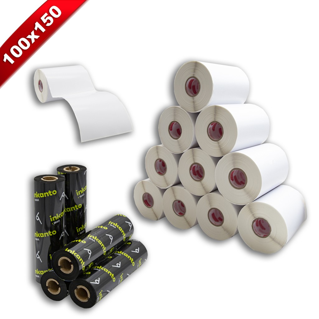 Kit 10 Rolos Etiqueta 10x15 100x150 Couche Adesiva Serrilha + 5 Ribbons Cera 110x74 para E-Commerce (200 etq/rolo)