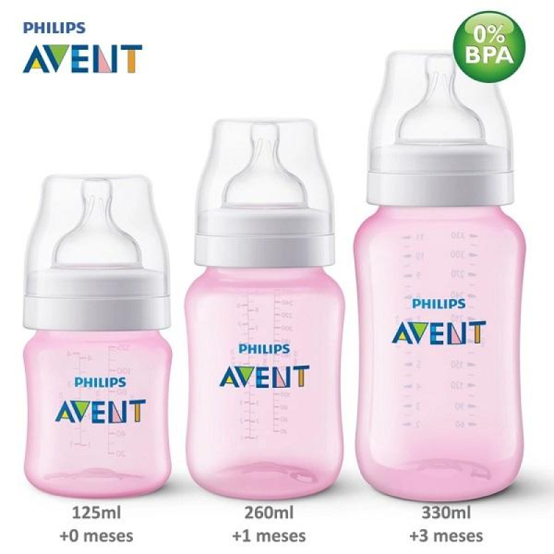 KIT COM 3 MAMADEIRAS ANTI-COLIC 125ML/260ML/330M ROSA PHILIPS AVENT SCD809/42