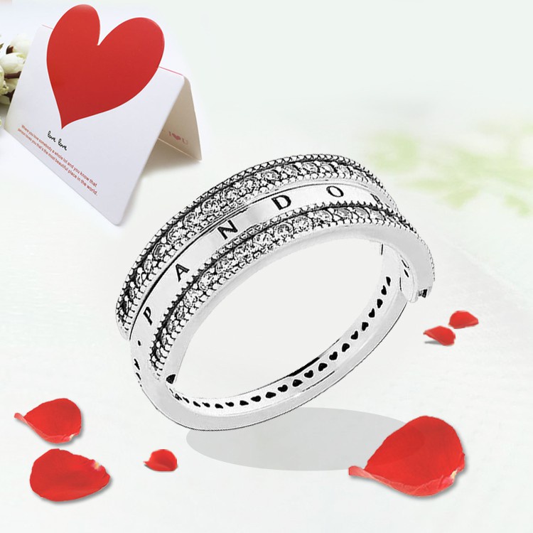Com Caixa s925 Anel de Prata PAN Anel Duplo Coração Feminino Anel Aberto Anel Ajustável Anel Feminino Jóias requintadas Presente
