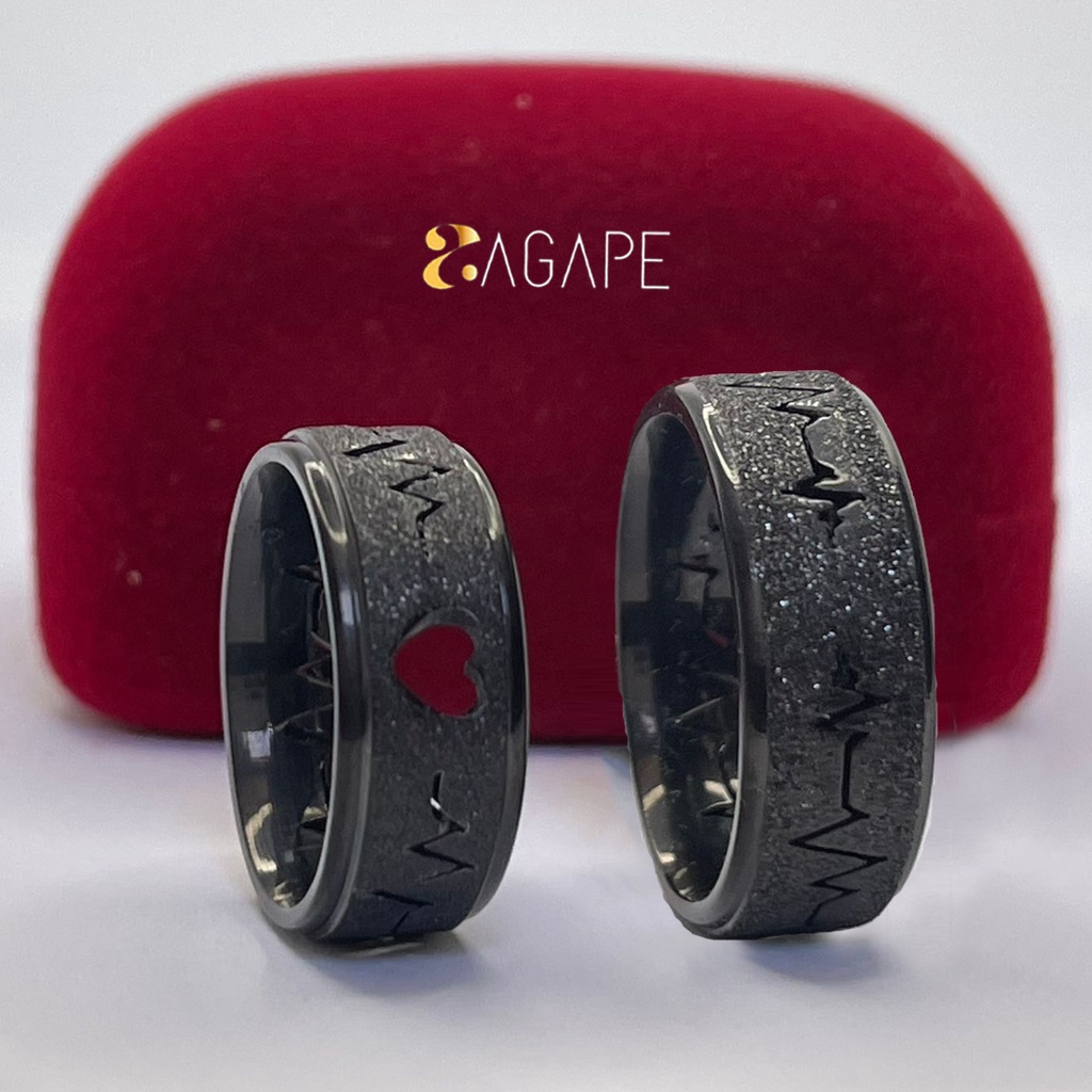 Alianças em Aço Inox Preta - Unidade ou Par com caixinha de veludo - Diamantada Uma Com Coração e Batimentos e Uma só com Batimentos - 8mm