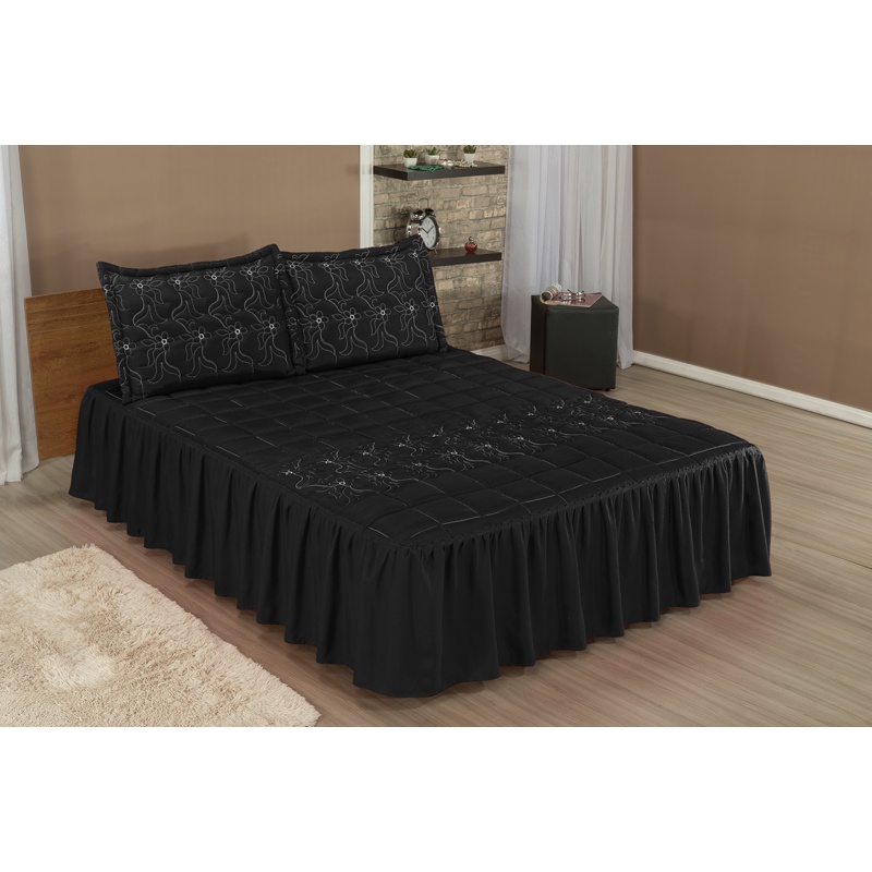 Colcha Casal Com Babado Cobre Leito Padrão Bordada MATELASSE 03 Peças PRETA