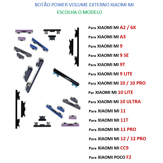 Botão Externo Power Volume Xiaomi Mi A2 / 6X / Mi8 / Mi9 / Mi9t / Mi10 Lite / MI9se / MI11 Pro / MI9 Lite / CC9 / Mi12 / MiA3 / Mi10 Ultra