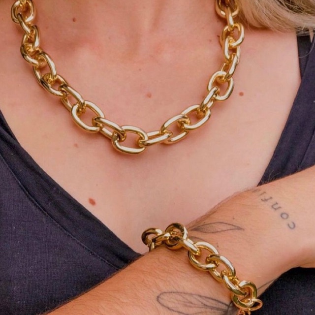 Colar e Pulseira Corrente Elos Feminino Banhado A Ouro 18k Antialérgico