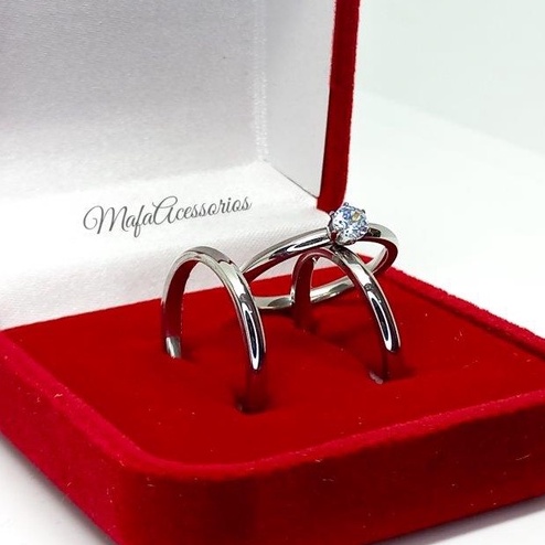 Par de Aliança Namoro Compromisso Aço Polido 1mm Extra Fina Prata + Solitário + Caixinha Vermelha