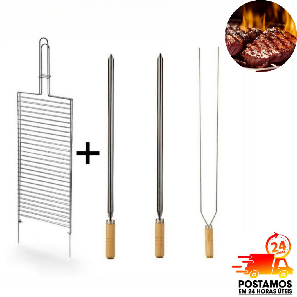 kit churrasco com 1 grelha e 3 espetos churrasqueira a carvão churrasco