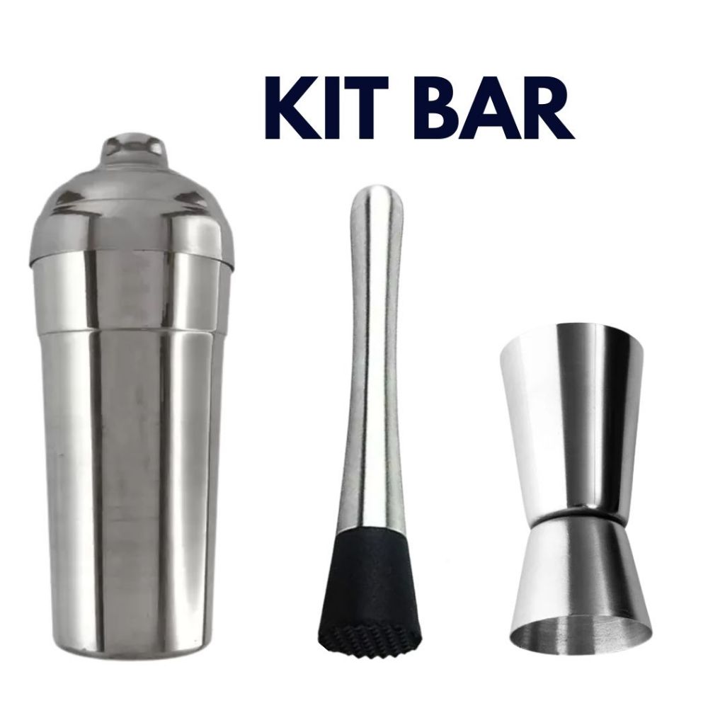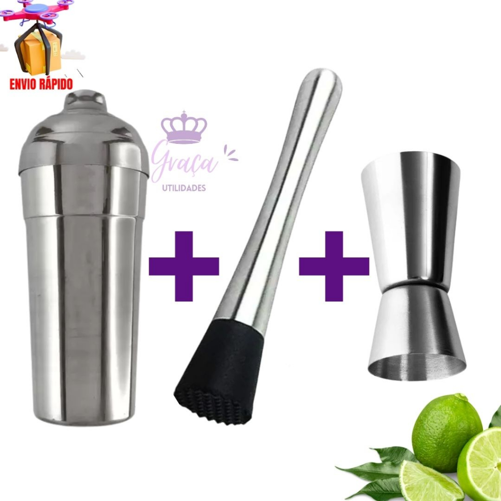 Kit Coqueteleira De Alumínio Com Socador E Dosador Duplo 25 e 50 Ml Para Bebidas Drink Caipirinha Bar Restaurantes e bar