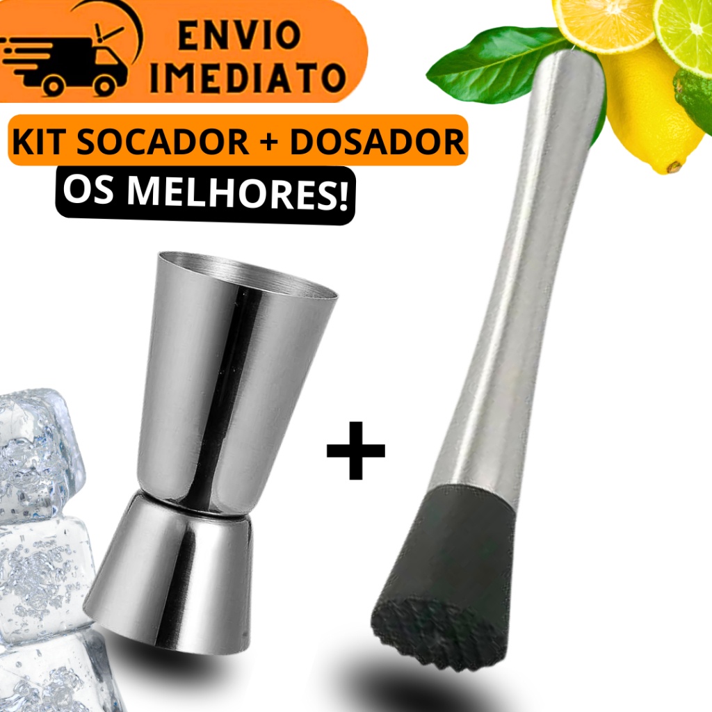 Kit Coqueteleira De Alumínio Com Socador E Dosador Duplo 25 e 50 Ml Para Bebidas Drink Caipirinha Bar Restaurantes Resistente
