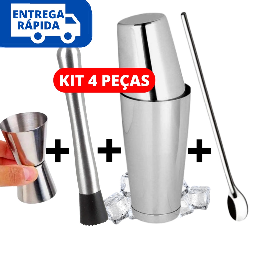 Kit 04 Peças Coqueteleira Inox 800ml Boston + Socador de Bebidas Macerador+ Dosador Duplo + Colher Bailarina 30 cm Inox Bebidas