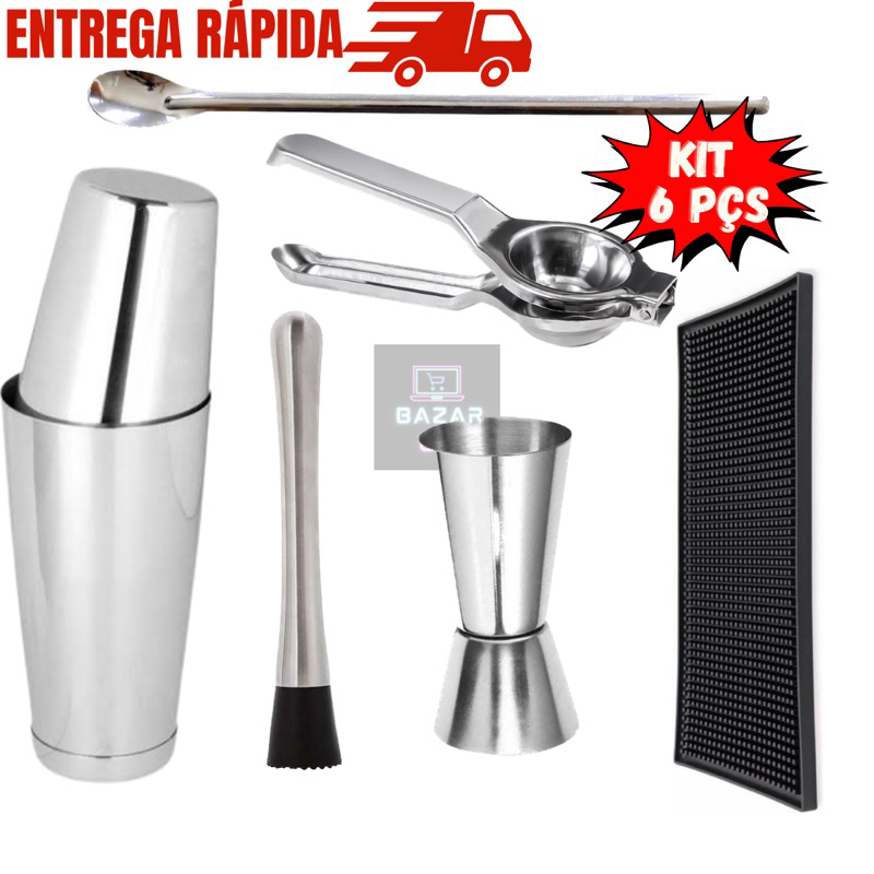 Kit Bartender 6 peças Inox Coqueteleira Boston 820 ml + Socador + Espremedor + Colher Bailarina + Dosador de Bebidas + Escorredor