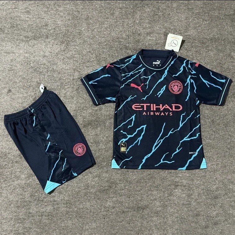 Novo 2023/2024 Infantil Kit Camisa de Time Conjunto Manchester City Away Criança Camiseta Blusa Camisa de Futebol Calções