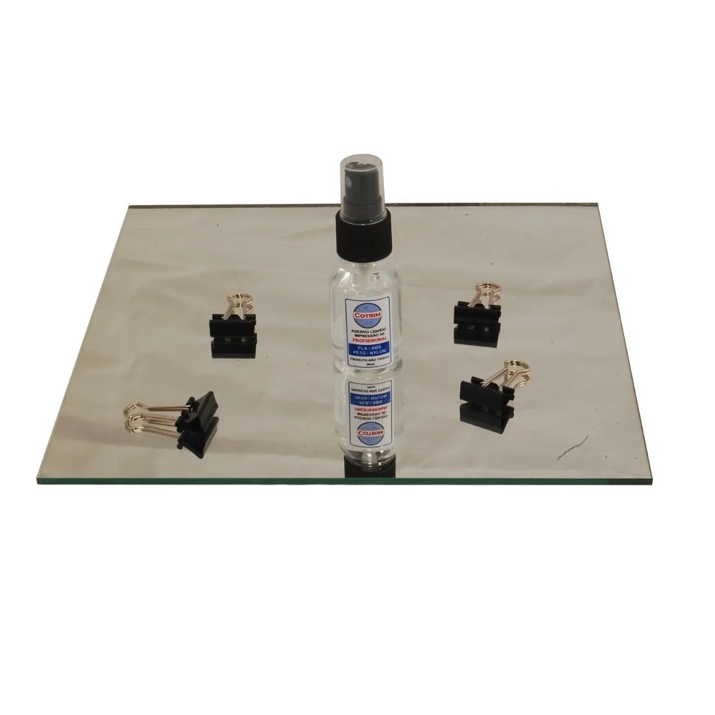 Base Mesa compatível com impressora 3D Creality Ender 3 Vidro e Espelho 235mm com 4 Presilhas e Adesivo líquido