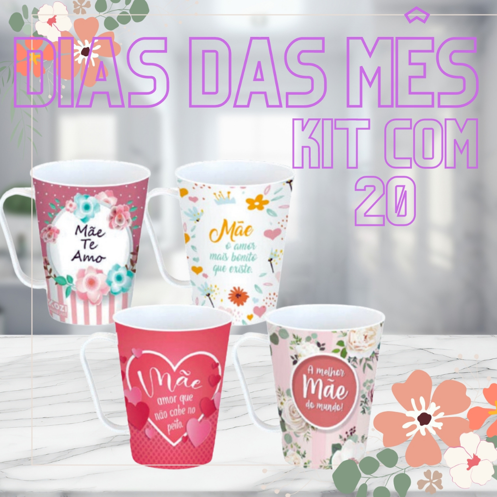 kit 20 Caneca Decoradas Dias Das Mães Plástico Presente Com Alça Resistente Com Frases Maes 430Ml
