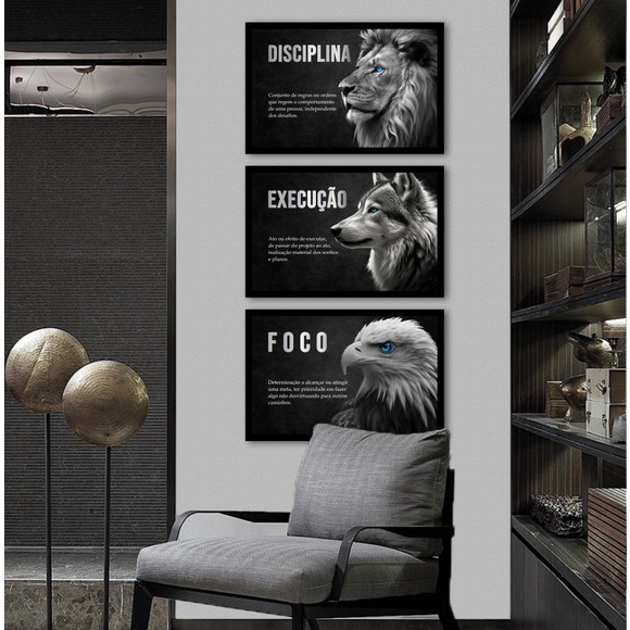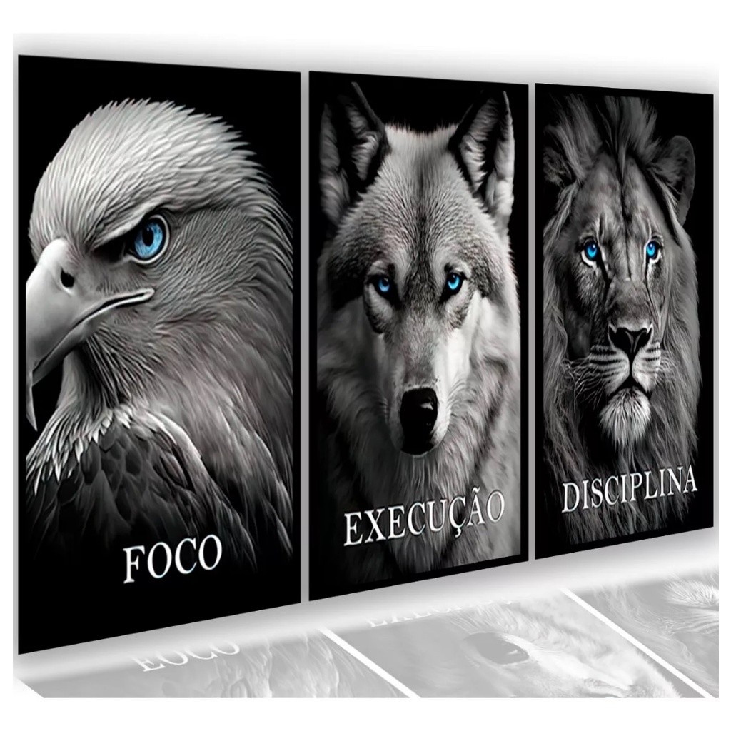 Kit 3 Quadros Decorativos Motivacionais Disciplina Leão Execução Lobo Visão Águia Sala Empresa Escritório Tamanho Gg Exclusivo Lançamento