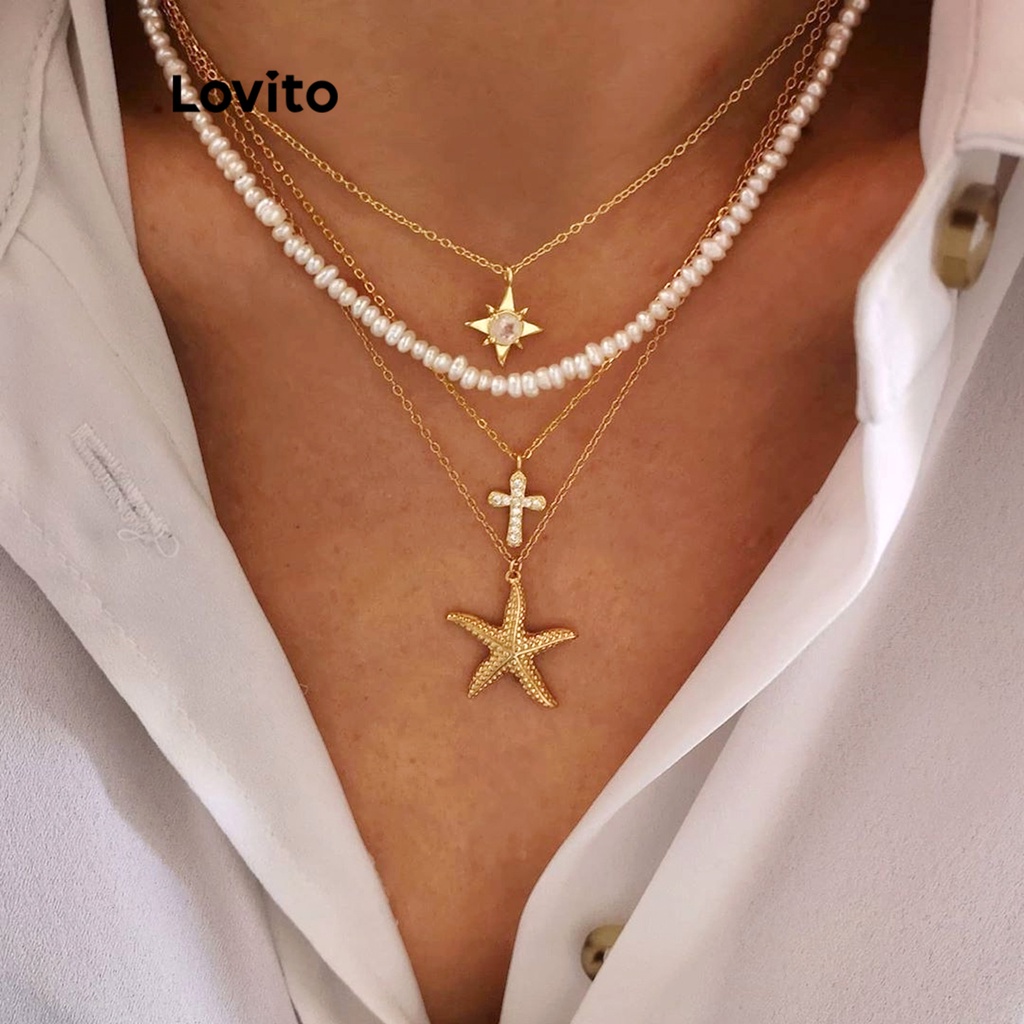 Lovito Colares Femininos Casuais De Pérolas Lisas Estrela Crucifixo Estrela Do Mar L57AD094 (Ouro)