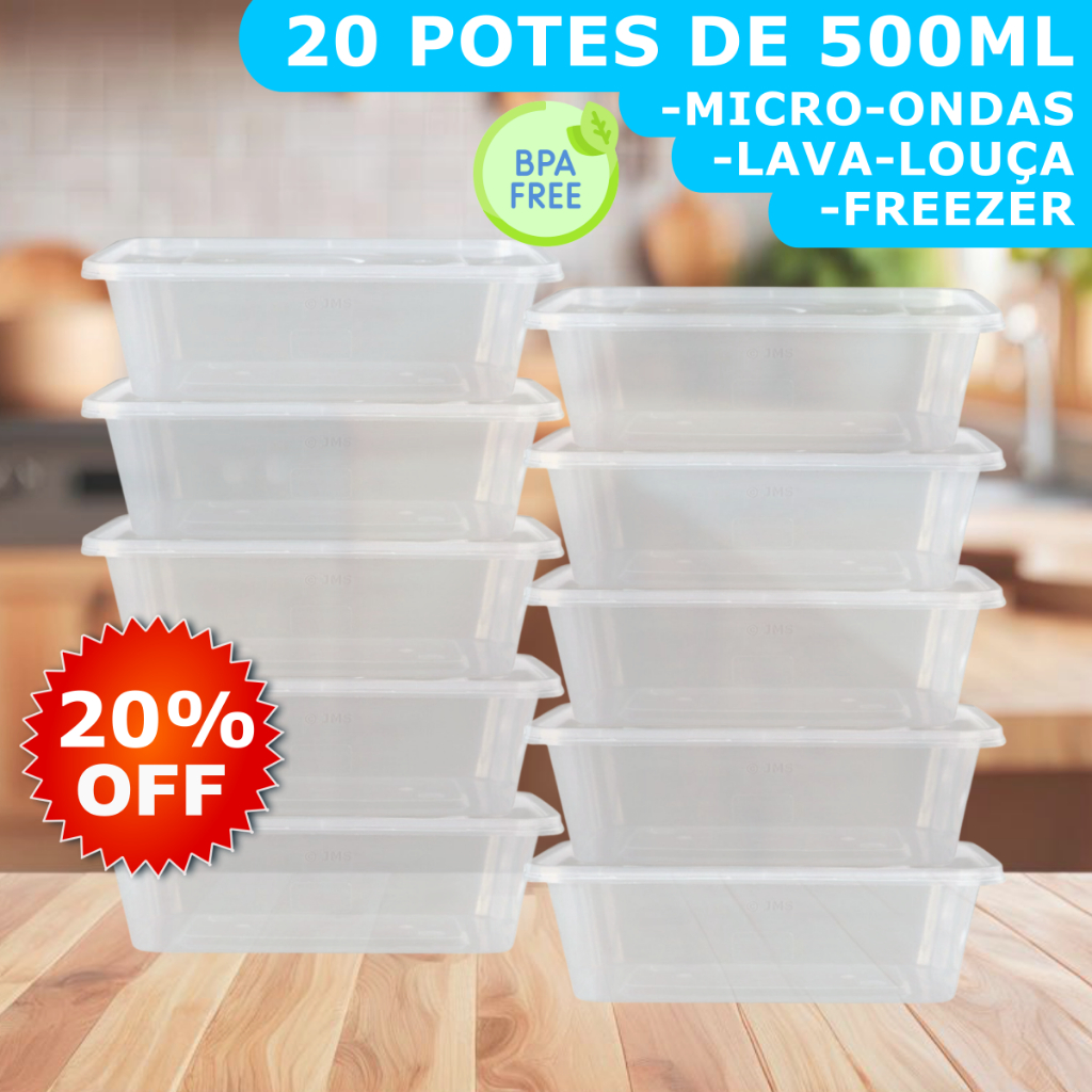 Kit 20 Potes 500ml Reutilizável Transparentes BPA FREE Freezer Microondas Marmita Organizador