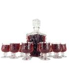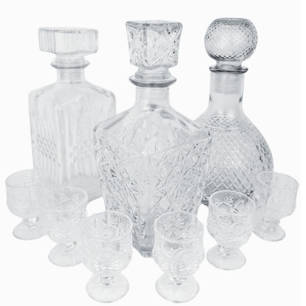 Jogo 3 Frascos Vidro Licoreira + 6 Mini Cálices Cristal Lapidada Whisky Licor Decoração