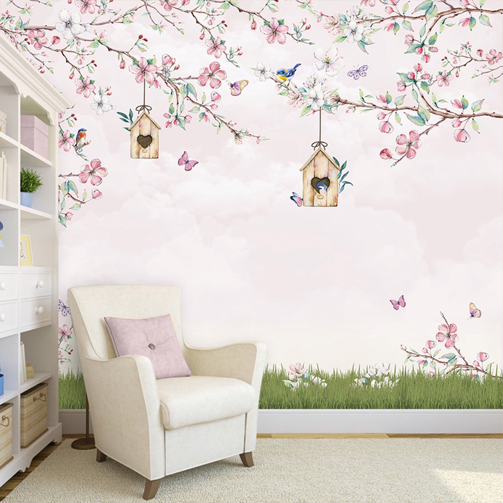 Papel de Parede Jardim Encantado Galhos Flores Casa de Pássaro Quarto Menina m²