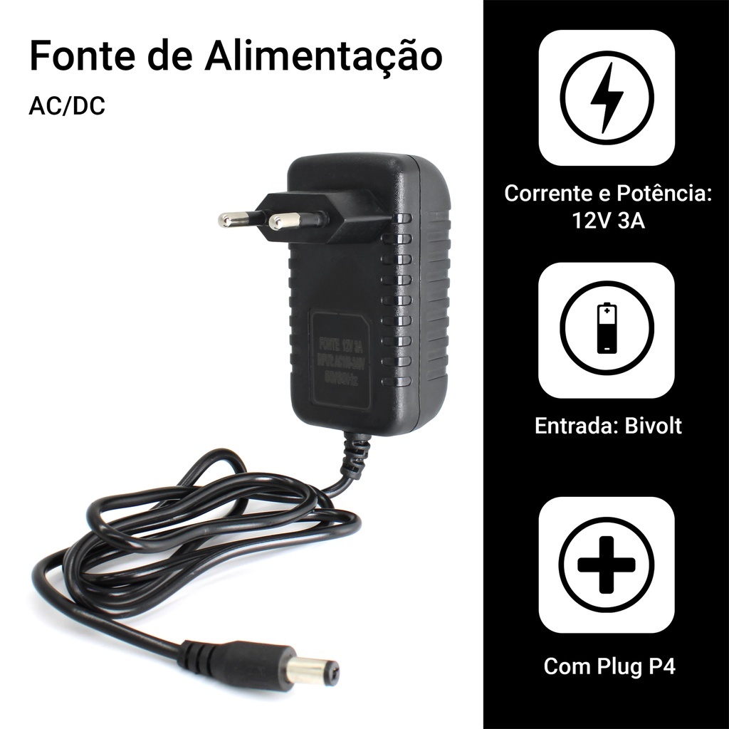 Fonte de Alimentação 12V 3A Bivolt 110V 220V P4 Estabilizada - CFTV Câmera Fita LED Modem Teclado