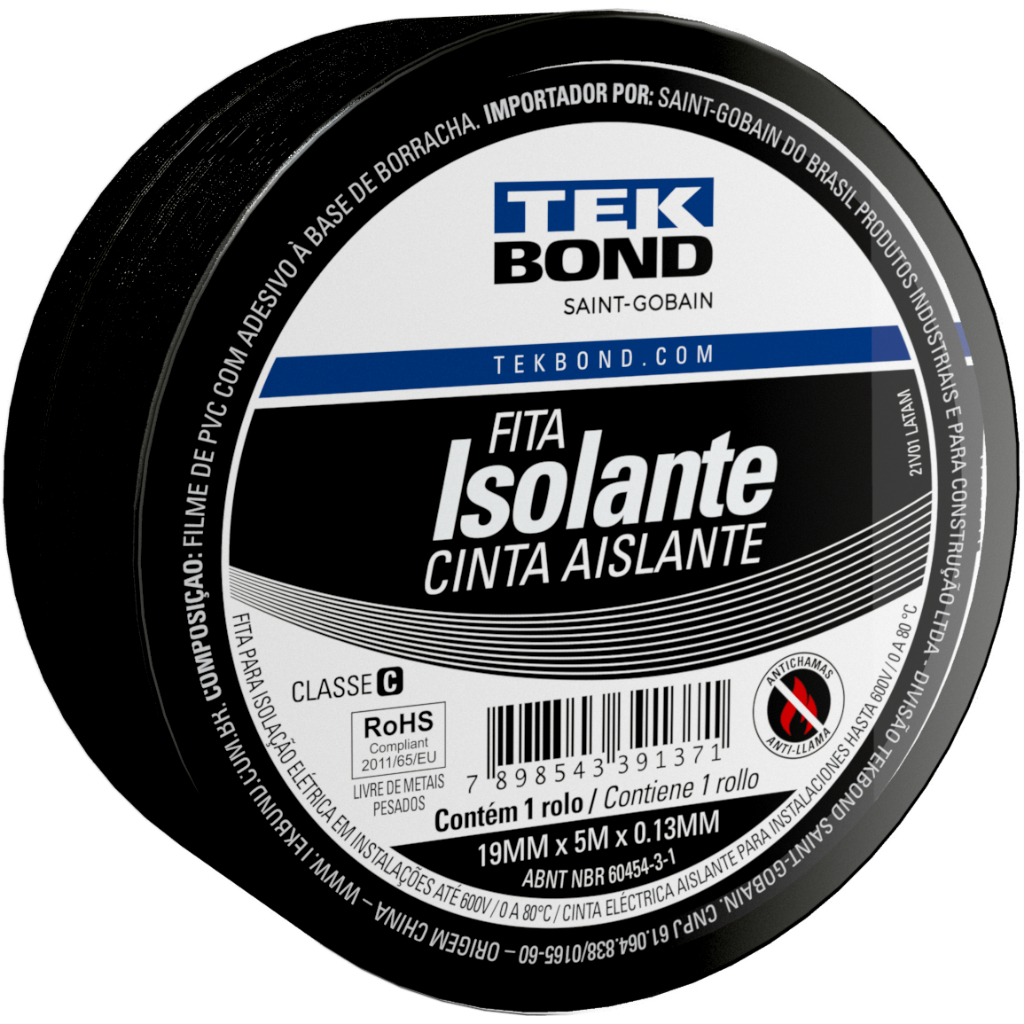 Fita Isolante Tekbond 19mm x 5m Kit 10 Rolos Antichamas Até 600V Resistente UV Elétrica