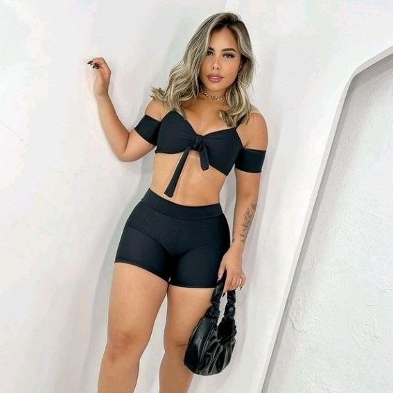 Conjunto Feminino Short e Cropped com bojo suplex modinha top com ou sem manga alcinha e laço