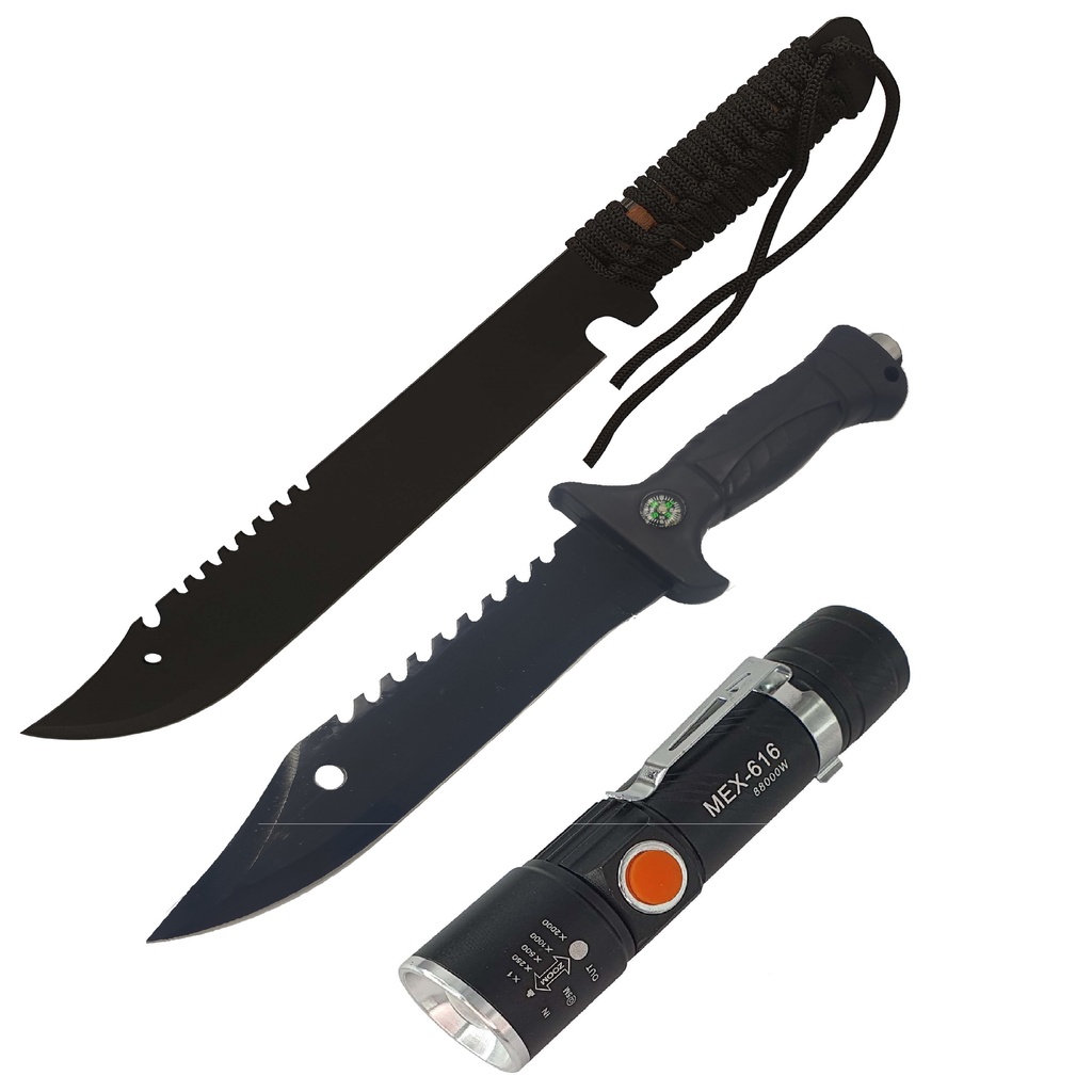 Combo Sobrevivência Facão + Faca Tipo Militar Aço Inox + Lanterna Usb Recarregável