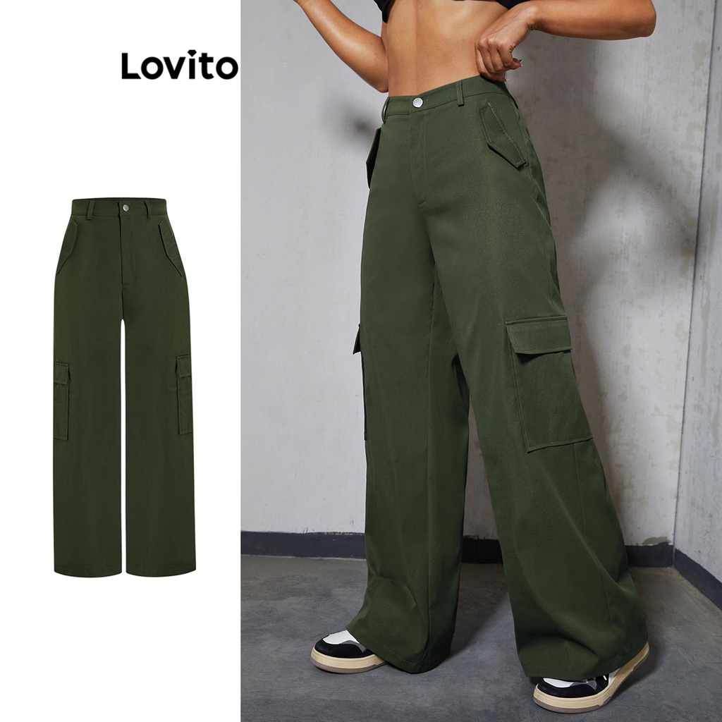 Lovito Casual Calça Feminina Lisa com Bolso LBA05032 (Verde Militar)