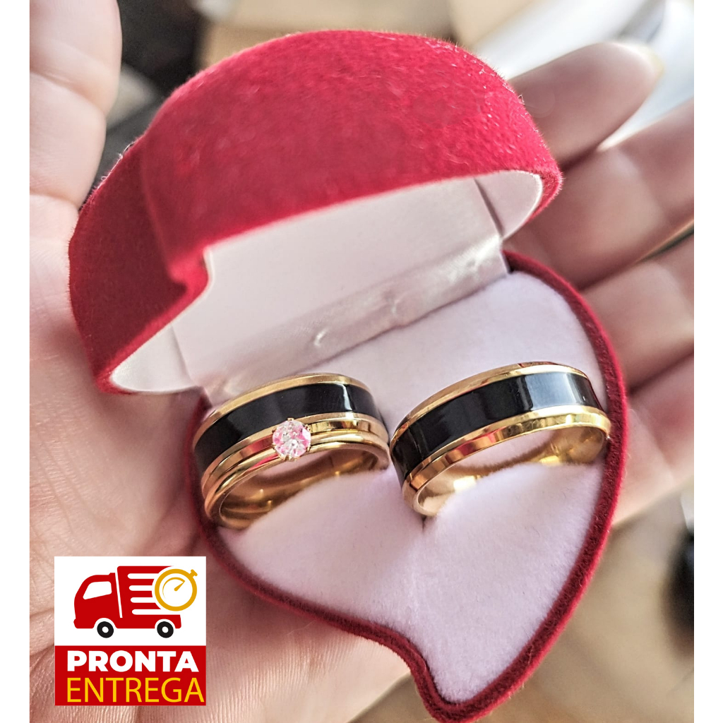 Par Alianças de Casamento Preta e Dourado Folheada Ouro 18K Grossa 8mm Luxo