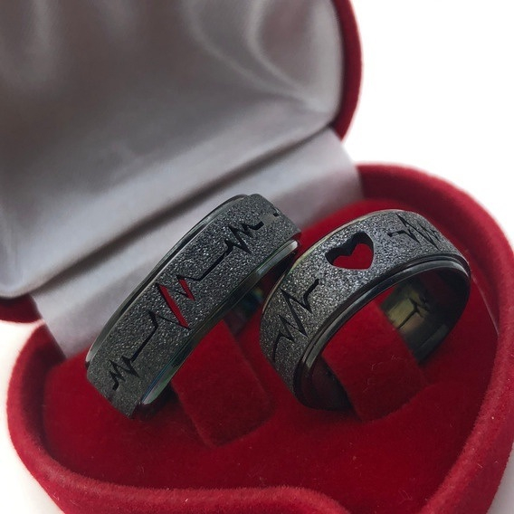 Alianças em Aço Inox Preta - Unidade ou Par com caixinha de veludo - Diamantada Uma Com Coração e Batimentos e Uma só com Batimentos - 8mm