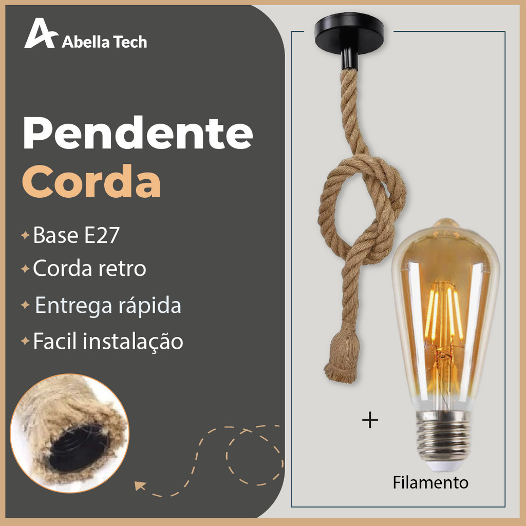 Pendente Lustre Luminária Vintage Corda Sisal Retro Rústico Com Soquete Bocal E27 Canopla De Metal Fio Para Teto