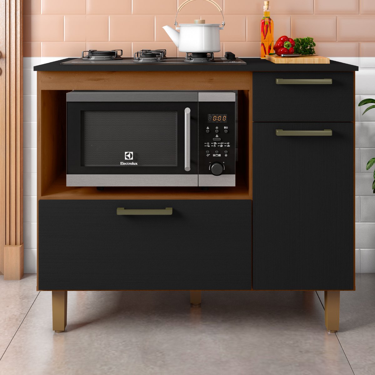 Balcão de Cozinha Para Cooktop 5 Bocas Nicho para forno 2 Portas 1,10m Master Nature / Preto Zanzini