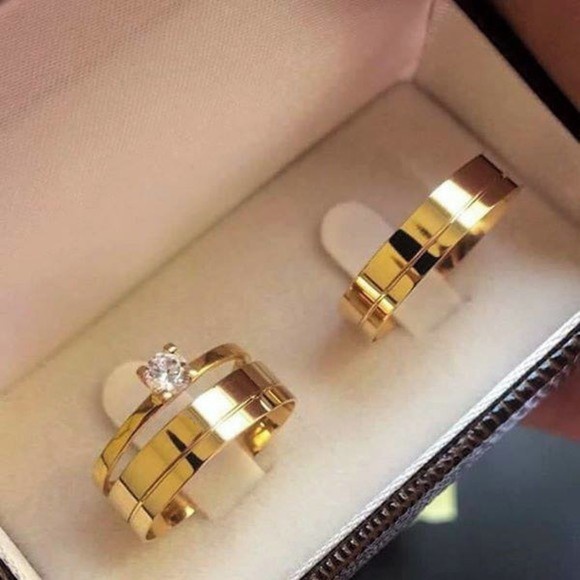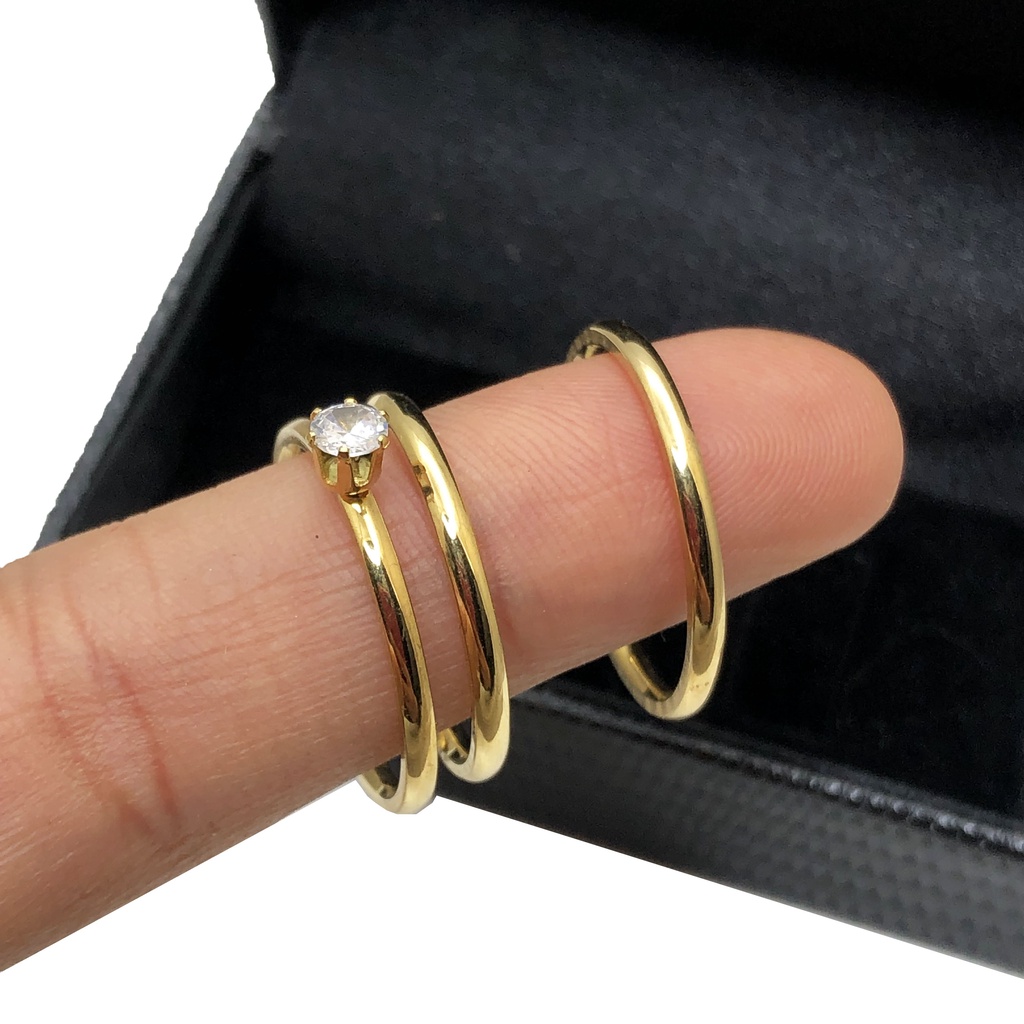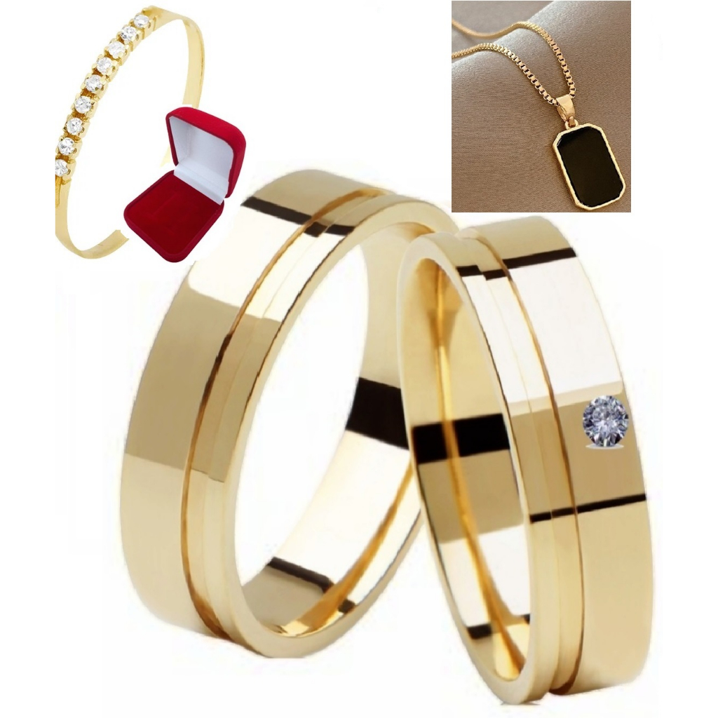 Par De Alianças Noivado Casamento Lisa + Anel Solitário 4mm Aço Inoxidavel Banhado Dourado Brilho Ouro 18K