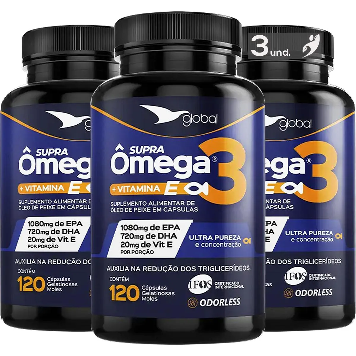 KIT 3 ÔMEGA 3 COM VITAMINA E 1500MG GLOBAL SUPLEMENTOS 120 CáPSULAS